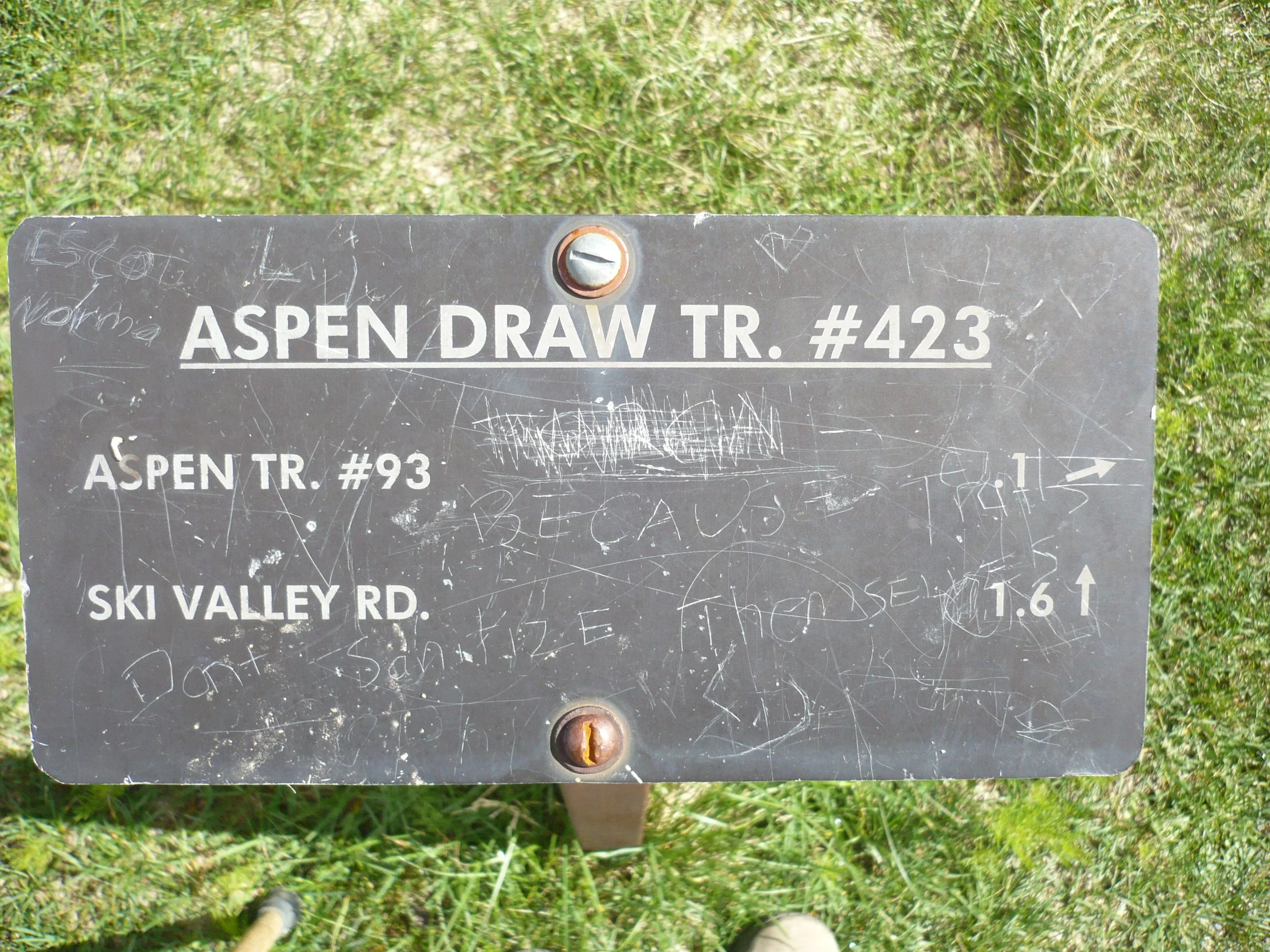 If you want to hike down the trail, continue driving on Ski Run Road to the top of the mountain. Park next to rusting ski lift equipment on your left. Walk east past the ski lift toward a little building on your left, where you will find the following trailhead sign: