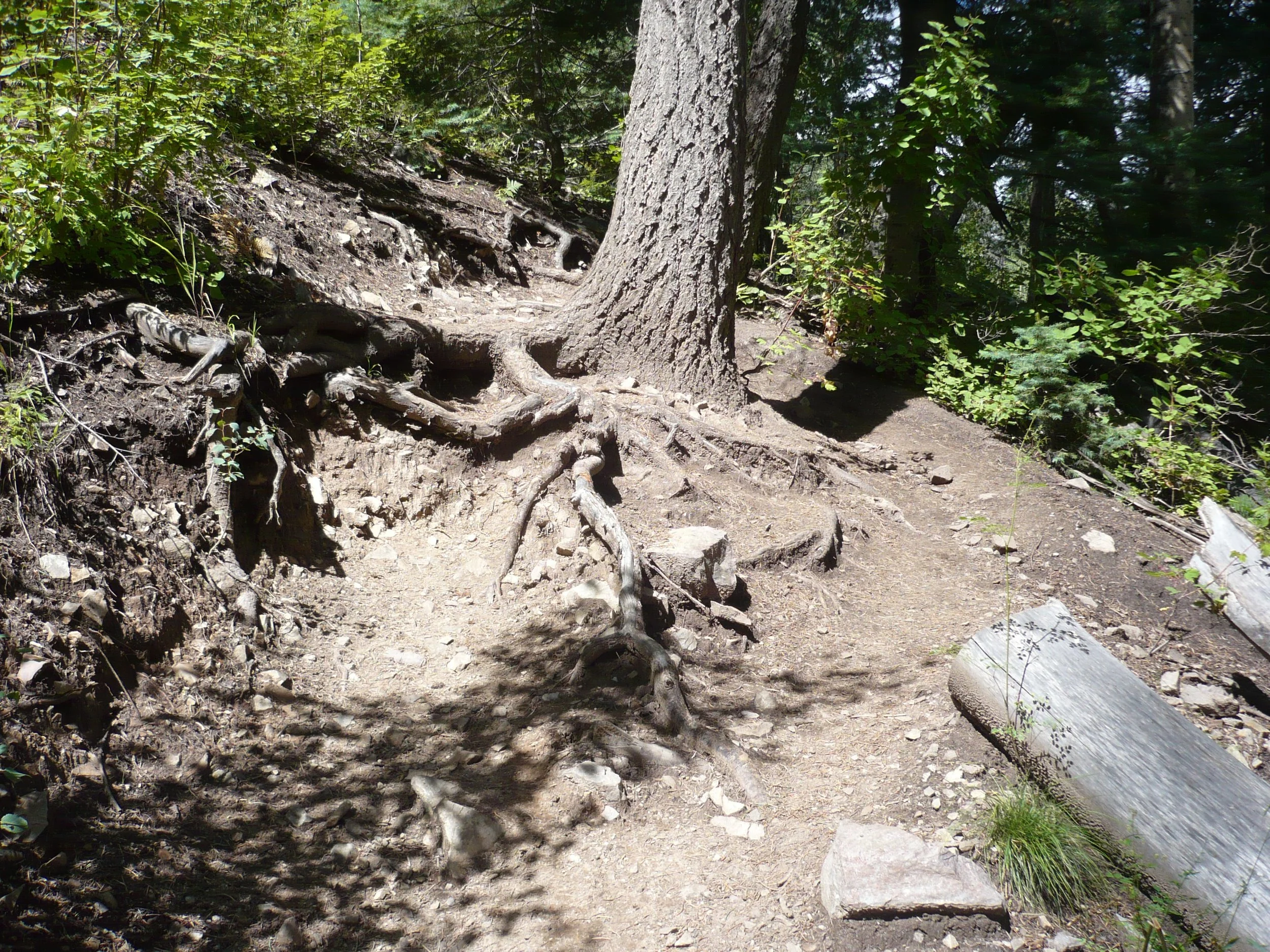 Current condition: (9/17/23) The trail is badly eroded in many places, causing rocks and roots to stick up out of the tread several inches, and sometimes even one foot! There are no down logs, and the vegetation is cut back on both sides.