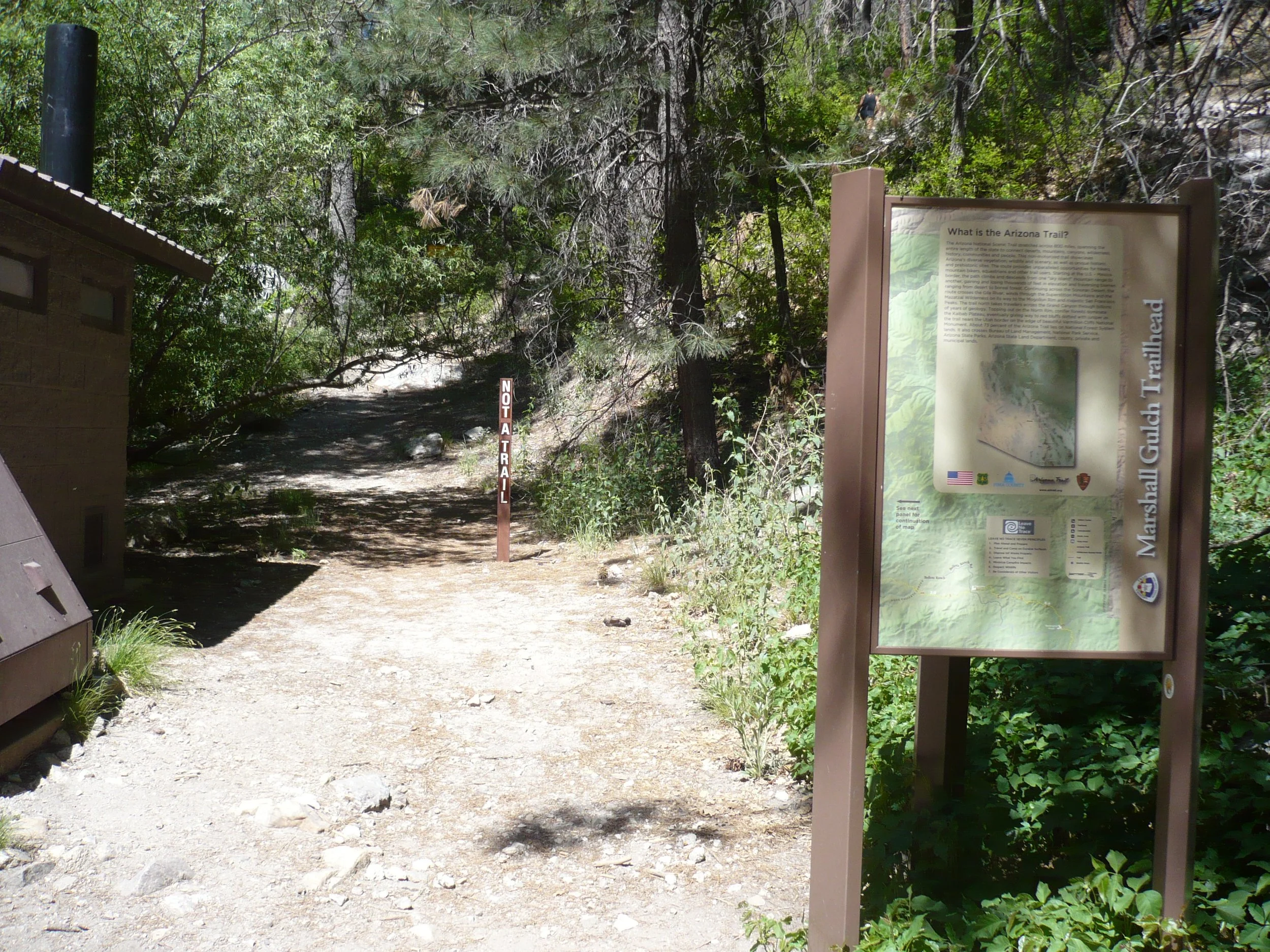 The Marshall Gulch Trail ends at Marshall Saddle. At the saddle is a five-way junction, where the Marshall Gulch Trail heads east, the Wilderness of Rocks Trail heads west, the Aspen Trail heads north and south, and the Mint Springs Trail heads northeast toward Summerhaven.